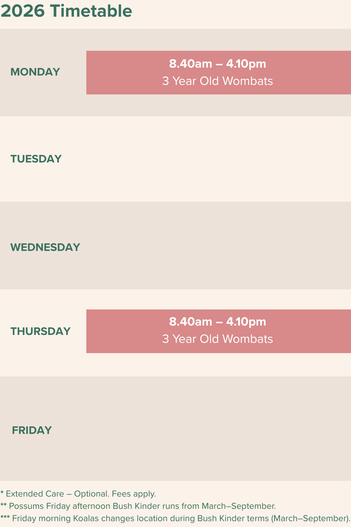 Wombats Group has an emphasis on having fun while learning to share and co-operate with each other in a happy, safe, relaxed, well structured educational environment. This allows each child the time, space and support to experience and develop in their own individual way. The program is developed around each child’s individual needs as well as stimulating and encouraging a ‘hands-on’ environment. This program helps develop their everyday skills and is as a wonderful transition to 4 Year Old Kindergarten.